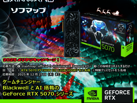 株式会社ニューエックス(本社:東京都千代田区)は、取り扱いブランドであるGAINWARD社より、公式X(旧Twitter)にて、株式会社ソフマップが運営するSNS「ソフマップ【公式】」と連携し、『GAINWARD × ソフマップ【公式】フォロー&リポスト 2025 メリクリキャンペーン!』を実施いたします。 ...